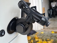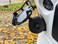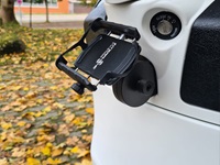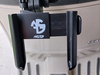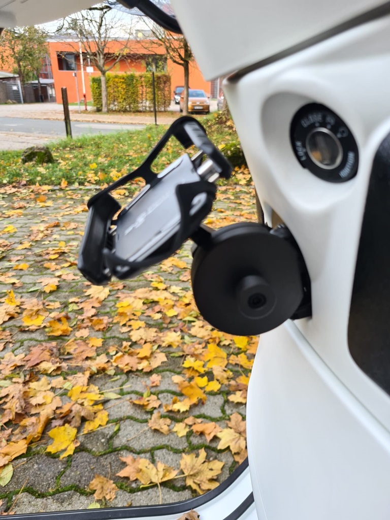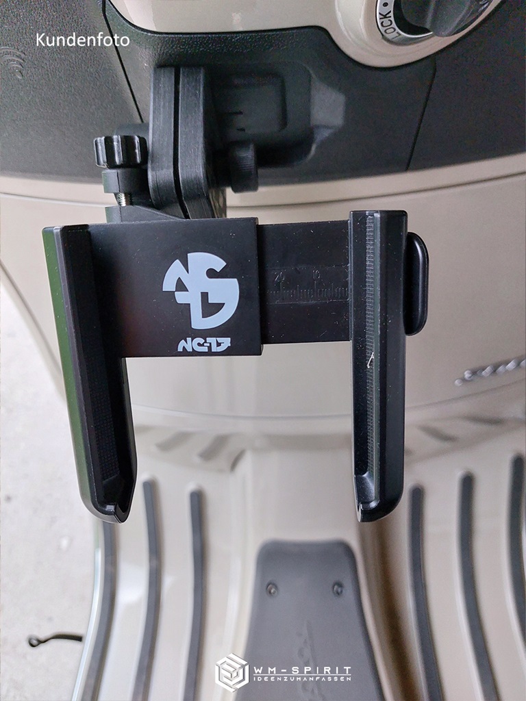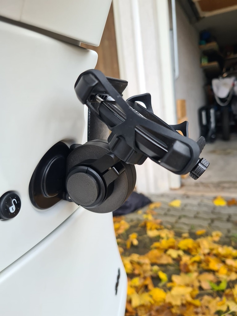 Die Klemmvorrichtung bzw. Haltevorrichtung ermöglicht das Anbringen gängiger Handys oder Smartphonehalter direkt am Gepäckhaken des Scooters.