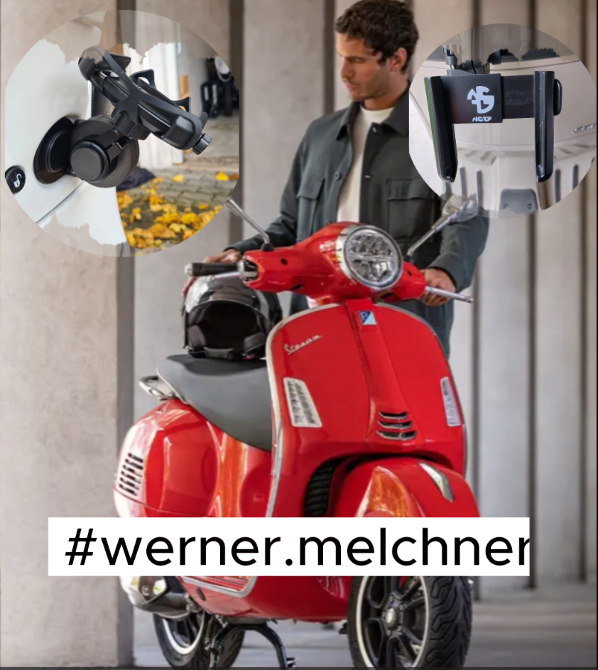 Mit dem neuen EasyClick-System inklusive integrierter Vibrationsdämpfung montierst du deine Handyhalterung blitzschnell und sicher – direkt am Gepäckhaken deiner Vespa!